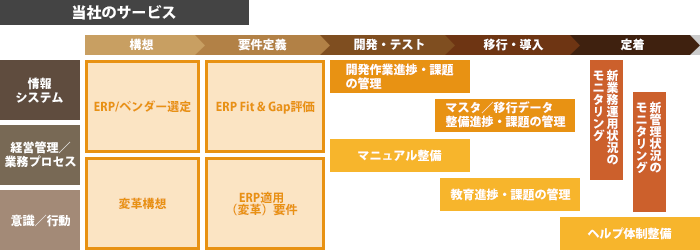 ERP知識を中心とした検討/準備段階から、ERP導入/定着までを一貫支援します。